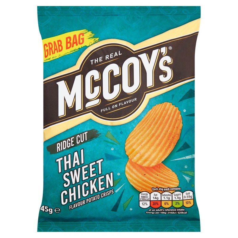 Ingredients | Potatoes, Sunflower Oil, Thai Sweet Chicken Flavour [Sugar, Maltodextrin, Salt, Dried Yeast Extract, Ground Spices (Red Chilli Pepper, Fennel, Aniseed, Clove), Natural Flavourings, Dried Onion, Dried Garlic, Acid: Citric Acid, Dried Parsley, Chilli Powder (Chilli, Cumin, Oregano, Dried Garlic, Salt), Red Bell Pepper Powder, Colour: Paprika Extract] |